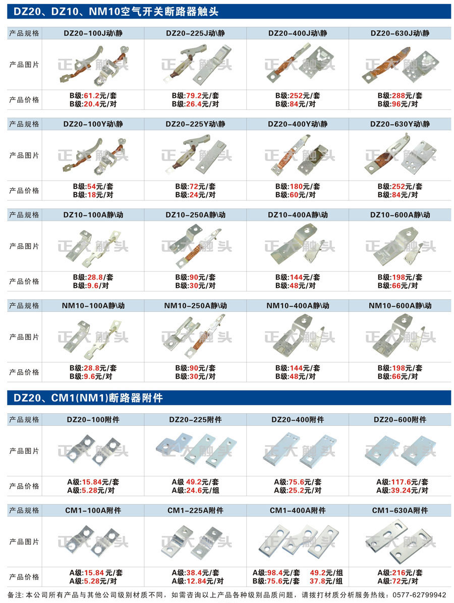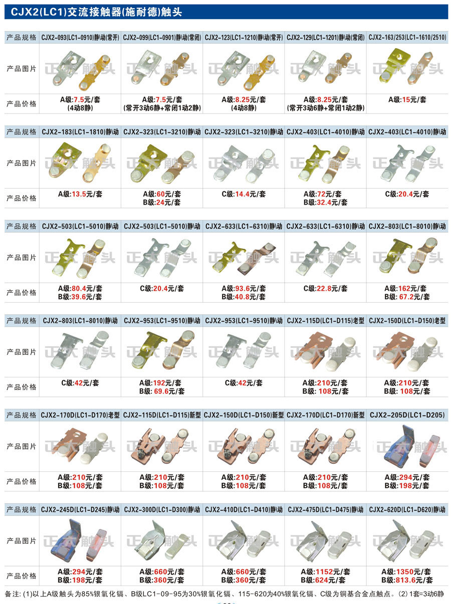 触头元件作为电器开关核心元件,主要用于接触器,继电器,断路器,凸轮控制器,补偿器,行程开关,脚踏开关,辅助开关等。正火电气现生产CJT1,CJX1,CJX2,CJX4,CJX5,CJX8(B系列)CJ20,CJ40,CJ12,CJ15,CJ24,CJ24Y,CJ0,CDC10,CJ91,CT91,CJ913,CJ914,CJ3,CJ8Z交流接触器触头,CZ0,CZ1,CZ3,CZ17,CZ18,CG5直流接触器触头,QJ3,QC83补偿器触头,凸轮控制器,主令触头,KT10,KT12,KT14,KTJ1,KTJ5,KTJ6,KTJ15(QT5),LK1,LK17,LK18,THQ1,TQKT等;断路器触头DW10,DW16,DW15,DW17,DW45,DZ10,DZ20,内燃机触头,矿用触头,叉车,吊车触头,JYN1,JYN2,ZN28,SN10,VS1,梅花触头等。进口ABB系列AF,EH,EK,富士SC系列,日立H系列,施耐德LC1系列,西门子3TF,3TB系列,LG公司(LS产电)GMC系列,三菱机电SN系列。与国内正泰,德力西,天正,人民等,国外ABB,施耐德,西门子,富士,三菱等厂家电气配套。